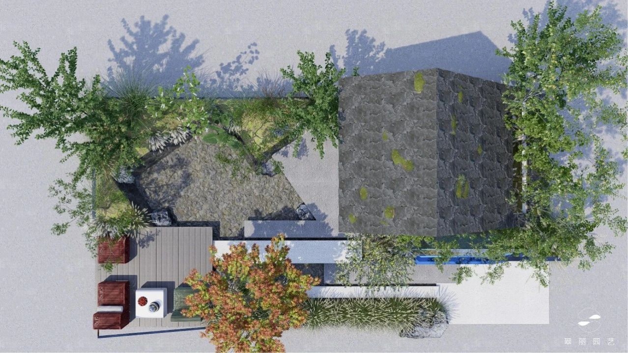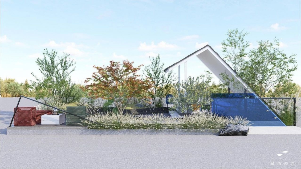 小院用三兩步汀步,一潭清水,搭配起伏的地形,融入自然的一花一草,一石一木,營造山水相依,小橋流水,草木為伴的靜謐空間。