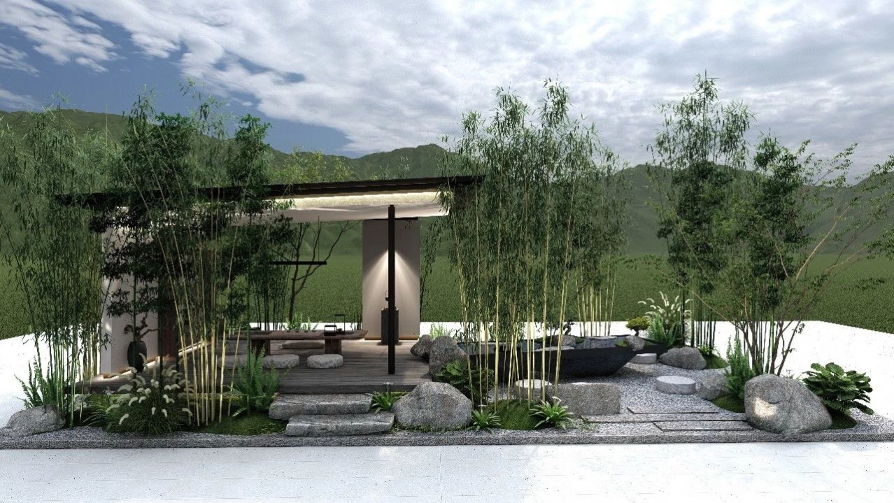 作品以西蜀最有代表性的竹林林盤空間為背景,通過地形塑造,興蜀道之崎嶇,造山“崖”之隱逸;流光竹影,溪流來去,得曲水流觴之雅致。我們想將西蜀的自然風光,和極具特色的四川人文、休閑文化融入一方小景,這是一種閑適,慵懶的市井文化,也是對“安逸”生活的樸素向往。園子四圍不圍合,以四川人的包容,灑脫,無論三朋四友,三教九流,來者是客,四面而來,八方而去,用一杯清茶,待江湖朋友。