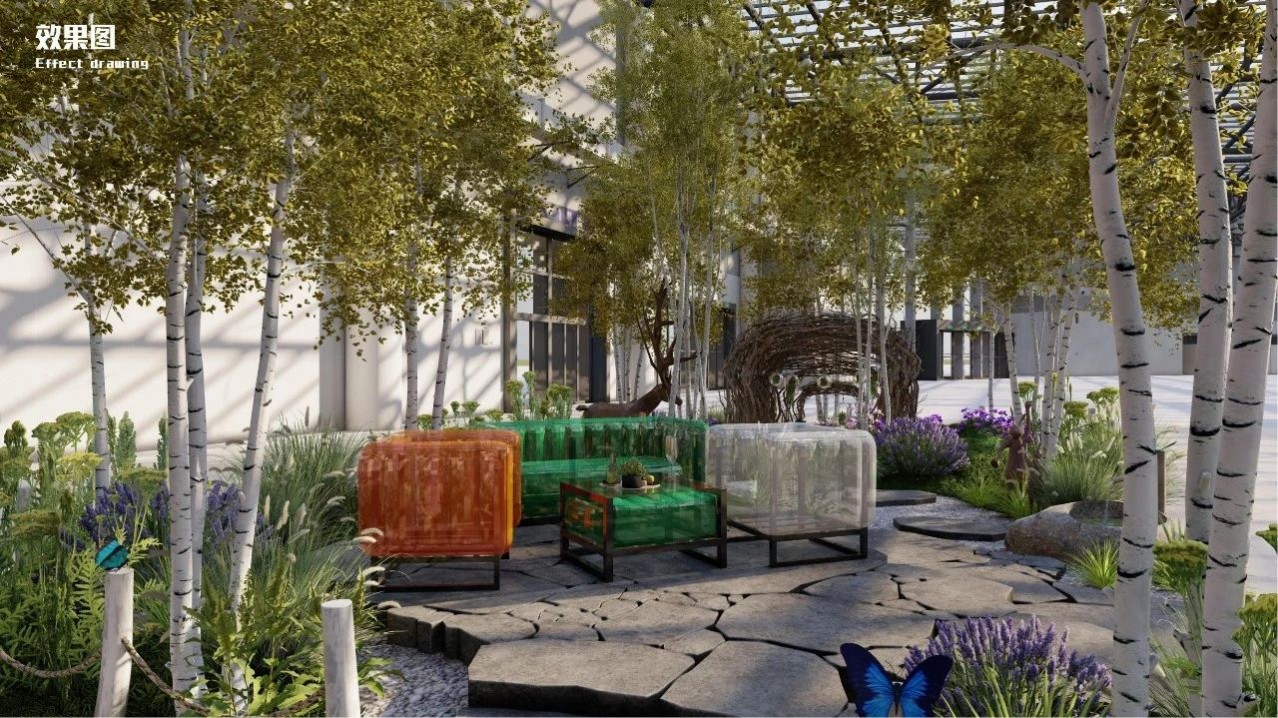 選用帶著遠方鮮意的白樺林進行自然山林空間造景,讓人們仿若置身于白樺林浪漫的秋色中。由設計師親自手作的安全島將成為白樺林中的冥想地,拙樸野趣自然,在音樂和梵香中,讓人靜下來自由冥想放松……精致而富有創意的生態缸點綴林間,蘊含生機活力,傳遞植物“家”的力量……