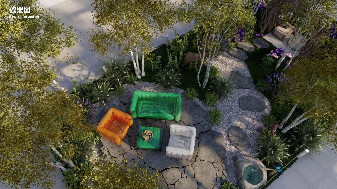 空間承載并展示了休閑、聚會、烤火等庭院常用的三大功能。這樣的展示設計貼近生活,詮釋了花園的生活意義。