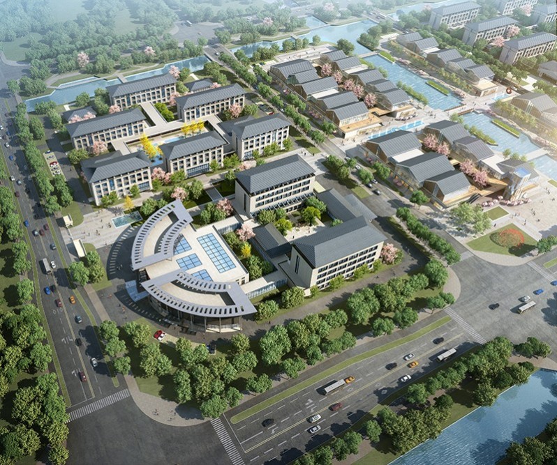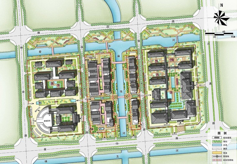 項目位于揚州市樸席鎮(zhèn),樸席中部片區(qū)一期規(guī)劃范圍內(nèi),其四至范圍為∶東起興席路,南臨金山路,西至坤余路,北靠橫四路,總建筑面積12.79萬平方米。以綠為基、以水為脈、以文為韻,并結(jié)合揚州以及樸席地方建筑及文化特色,將公共建筑融入傳統(tǒng)元素,體現(xiàn)樸席禪宗文化、水鄉(xiāng)文化和席鄉(xiāng)小鎮(zhèn)特色,塑造現(xiàn)代文明與古代文化交相輝映的揚派席風建筑風格。結(jié)合濱河步道、城市休閑綠道,串聯(lián)各城市生態(tài)休憩節(jié)點,構(gòu)成完整的健康活力環(huán)。依托麻線河兩側(cè)濱水商業(yè)街,打造公共服務休閑軸;根據(jù)功能分區(qū)特征,依托橫向景觀聯(lián)系,打造各功能聯(lián)系發(fā)展軸。規(guī)劃依托北側(cè)愛香河及公共綠地打造富有地方特色的濱河景觀廊道;依托南側(cè)城市綠帶,打造富有生機活力的城市休閑廊。形成康養(yǎng)服務片區(qū)、商業(yè)服務片區(qū)和醫(yī)療服務片區(qū)。